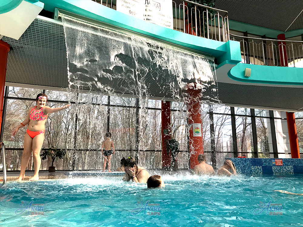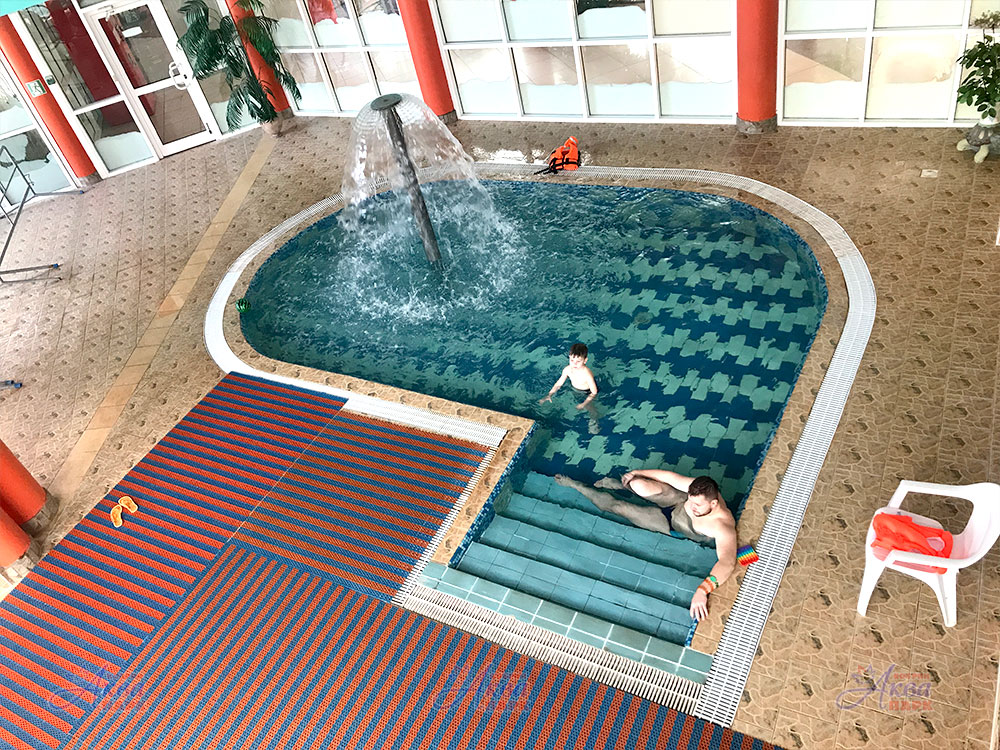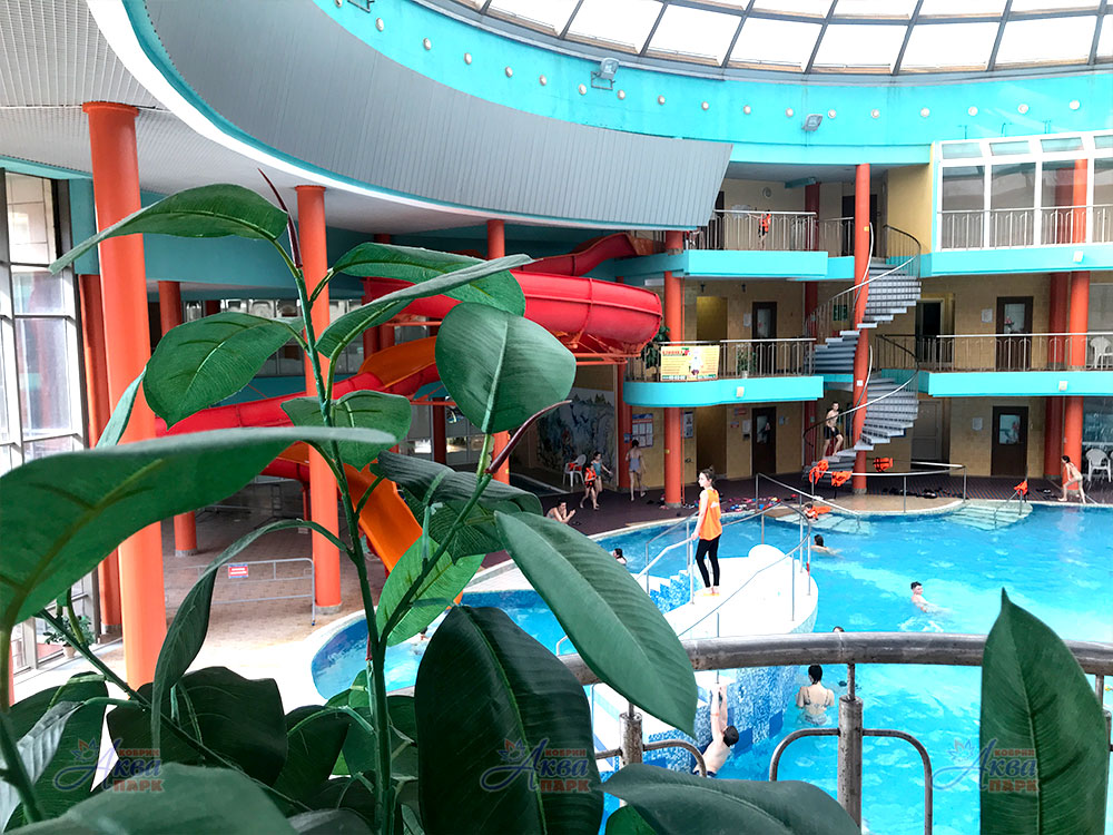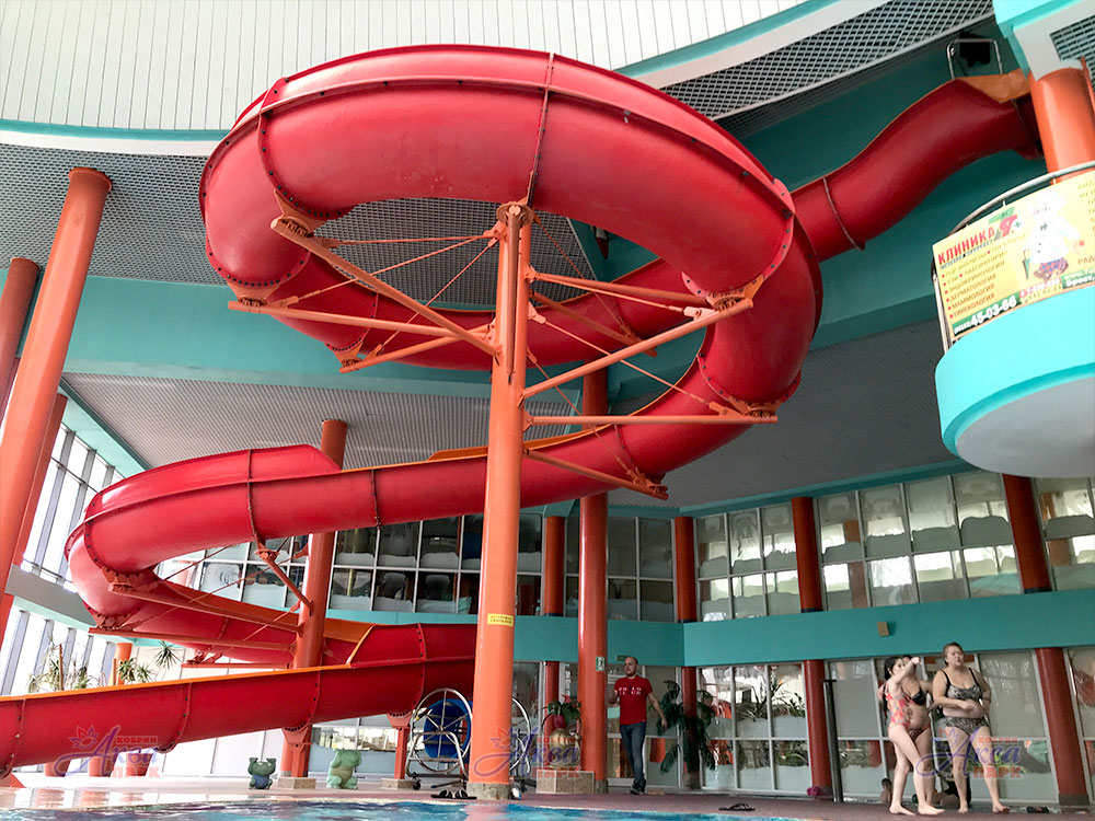 К вашим услугам в главном бассейне три водные горки, три джакузи, гидромассажные струи, имитация летнего дождя и два водопада. Для детей есть отдельный неглубокий бассейн. Вода в детском бассейне на несколько градусов всегда выше, чем в основном для комфорта маленьких посетителей.