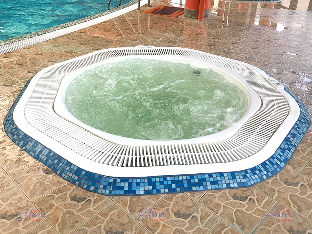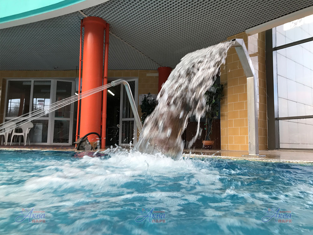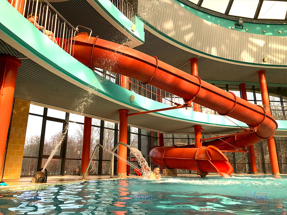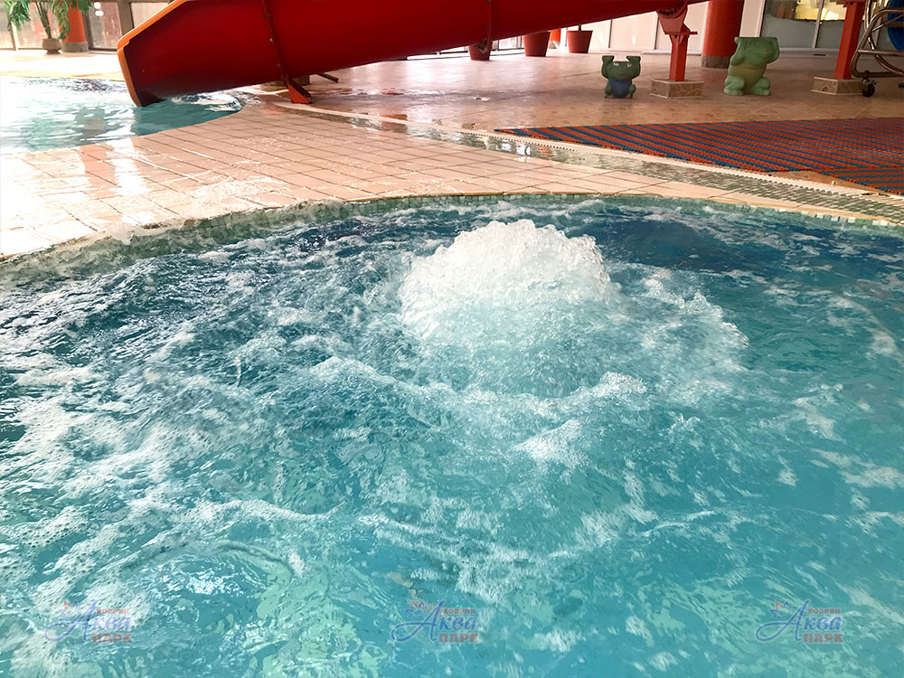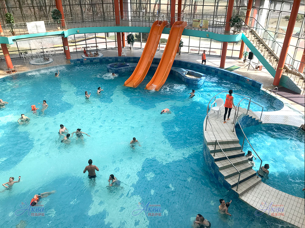 К вашим услугам в главном бассейне три водные горки, три джакузи, гидромассажные струи, имитация летнего дождя и два водопада. Для детей есть отдельный неглубокий бассейн. Вода в детском бассейне на несколько градусов всегда выше, чем в основном для комфорта маленьких посетителей.